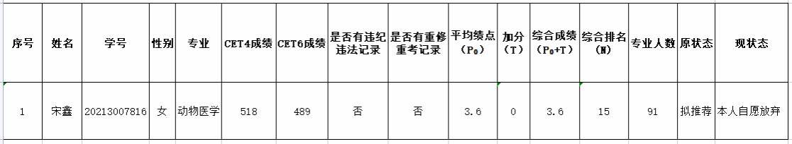 因动物医学专业有一名学生主动放弃推免资格,现对主动放弃推免生资格的名单予以公示,具体见下表。
