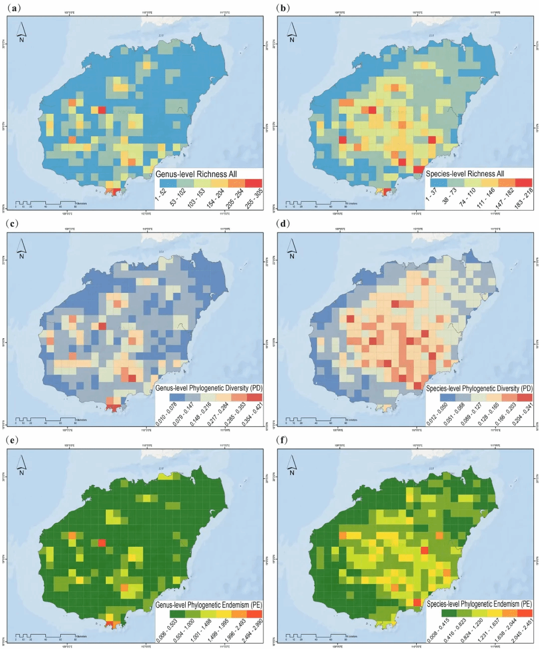 1   海南本土植物的丰富度、系统发育多样性(PD)和系统发育特有性(PE)。(a) 属级丰富度;(b) 种级丰富度;(c) 属级系统发育多样性;(d)种级系统发育多样性;(e) 属级系统发育特有性;(f) 种级系统发育特有性。