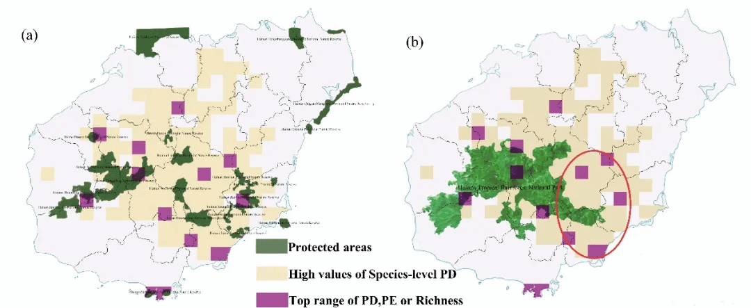 2,结合海南自然保护区(a)和海南热带雨林国家公园(b)系统发育指标的高值,确定重点区域和保护空白,海南自然保护区和海南热带雨林国家公园绿色表明