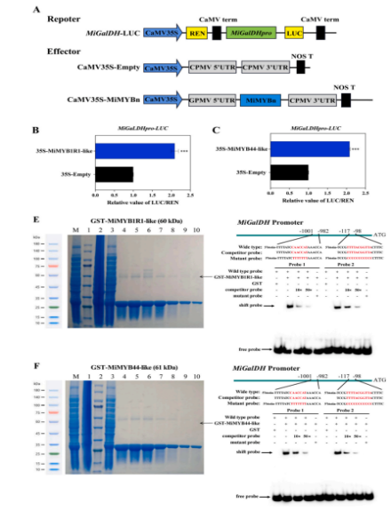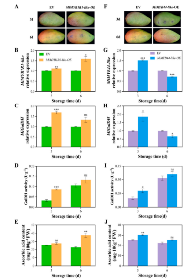 芒果(Mangifera indica L.)是富含抗坏血酸(AsA)的呼吸跃变型果实,其快速成熟过程由乙烯信号驱动,乙烯在调节AsA代谢中起着关键作用。本研究探讨了在乙烯介导的成熟过程中,MiMYB1R1-like和MiMYB44-like对MiGalDH的转录调控。结果表明,乙烯处理加速了成熟过程,并显著降低了GalDH的活性,导致AsA水平下降。RNA-seq分析显示,乙烯上调了MiMYB1R1-like,同时下调了MiMYB44-like。进一步的Y1H、EMSA和双荧光素酶实验证实了这两种转录因子可直接结合到MiGalDH启动子上以调控其表达。MiMYB1R1-like和MiMYB44-like的基因沉默(VIGS)显著降低了MiGalDH的表达和AsA含量,但提高了GalDH的活性,表明AsA再生增强以维持氧化还原的平衡。MiMYB1R1-like的过表达维持了GalDH的活性并促进了AsA的生物合成,而MiMYB44-like的过表达则表现出阶段特异性效应。总体而言,研究结果揭示了MiGalDH在AsA代谢中的关键作用,并确定了MiMYB1R1-like和MiMYB44-like作为重要的转录因子在芒果AsA代谢中发挥关键作用。这项研究为乙烯诱导的成熟和AsA代谢的转录调控提供了新的见解,为改善果实营养品质和延长货架期提供了目标。