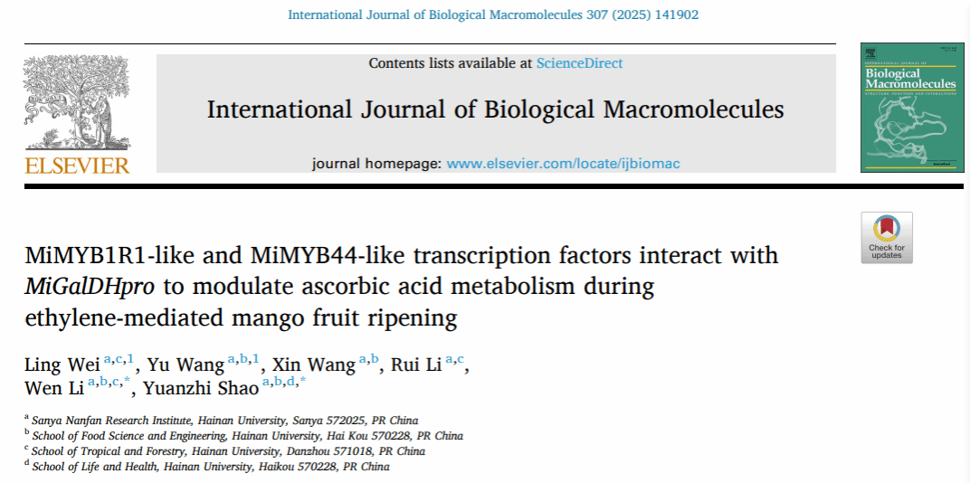 近日,李雯教授团队在国际知名期刊International Journal of Biological Macromolecules (中科院1区TOP, IF=7.7)上发表了题为“MiMYB1R1-like and MiMYB44-like transcription factors interact with MiGalDHpro to modulate ascorbic acid metabolism during ethylene-mediated mango fruit ripening”的学术论文。该研究得到了国家自然科学基金项目(32360778)和英国威廉希尔公司芒果产业技术体系的经费支持。