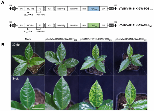 病毒诱导的基因沉默(virus-induced gene silencing, VIGS)技术被广泛用于基因功能研究。夜来香花叶病毒(telosma mosaic virus, TelMV)是百香果中检出率极高的病毒。本研究基于TelMV开发了病毒介导的蛋白过表达载体(virus-mediated protein ove-rexpression, VOX)和病毒诱导的基因沉默载体(VIGS)。该载体具有Gateway体系的重组位点,将其命名为pTelMV-GW,可用于快速克隆相关基因。研究表明:1)该载体可作为VOX载体在百香果中系统且稳定地表达绿色荧光蛋白(green fluorescent protei-n, GFP)和细菌八氢番茄红素合成酶(bacterial phytoene synthase, CrtB)两种外源蛋白;2)可作为VIGS载体沉默百香果八氢番茄红素脱氢酶(phytoene desaturase, PDS)和镁螯合酶I亚基(magnesium chelatase subunit I , CHlI)两个基因,致使其出现光漂白和叶片变黄的表型,但其沉默效果不显著。随后,为了进一步优化该载体的沉默效果,利用课题组前期报道的弱毒疫苗R181K(Wang et al., 2024)构建pTelMV-R181K-GW载体,该载体相较于pTelMV-GW显著沉默了百香果PDSCHlI基因(图1),沉默效率高达71%和89%,且沉默效果可持续至180天。综上,本研究首次开发了可用于百香果基因功能研究的VOX载体和VIGS载体,为后续百香果产量,农艺性状,抗病性等相关基因功能的研究提供重要工具。