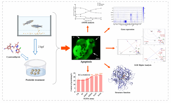 溴氰虫酰胺Cyantraniliprole)是近年来广泛应用于热区瓜菜害虫防控的新型农药,但其潜在环境风险和对水生生物的毒理作用尚未被充分认识。本研究利用斑马鱼模型,结合多元统计建模(SSPAMMIGGE biplot)与分子毒理学手段,系统揭示了该农药在暴露时间、浓度、基因型及其复杂交互作用的凋亡效应差异,并筛选出 TNF-αP53Caspase-8Bax Puma 等关键分子作为早期毒理学生物标志物。这一发现为农药减量增效与环境风险评估提供了重要的科学依据。
