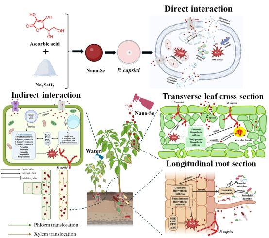 纳米硒nano-Se直接导致辣椒疫霉菌丝体的过氧化损伤,导致细胞渗漏、生物代谢抑制进而细胞死亡。辣椒植株中nano-Se的双向传导增强抗氧化能力。同时调节香豆素和苯丙烷的生物合成途径增加次级代谢物香豆素(6-硝基香豆素、6-羟基香豆素)、植物激素(JASA)和酚酸(阿魏酸、芥子酸)的含量,其中6-硝基香豆素(10 mg/L)通过氧化还原动态平衡和次代谢的双重调节显示出对辣椒疫霉的抑制作用。