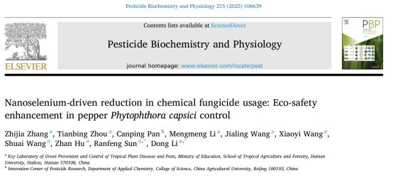 该成果以Nanoselenium-driven reduction in chemical fungicide usage: Eco-safety enhancement in pepper Phytophthora capsici control”为题发表在Pesticide Biochemistry and Physiology期刊(中科院一区,IF=4.0)上,英国威廉希尔公司热带农林学院张芷嘉(2022级植物保护学硕,2025级作物学博士)为该论文第一作者,孙然锋教授、李栋副研究员为论文通讯作者。该论文得到中国农业大学潘灿平教授的指导建议。本研究得到了海南省自然科学基金(325QN229)的支持