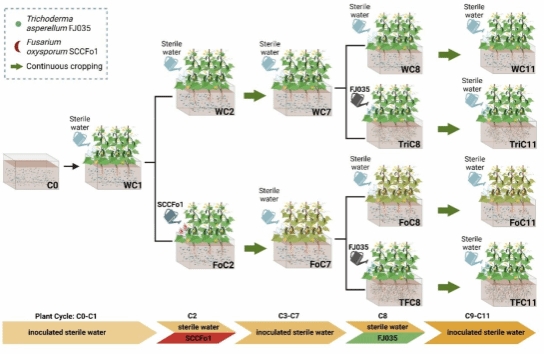 图1:在连作过程中棘孢木霉FJ035引入防控黄瓜枯萎病的示意图