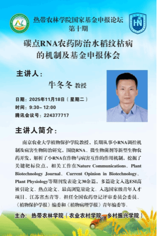 2025年11月18日上午9:30,由热带农林学院(农业农村学院、乡村振兴学院)主办的国家自然科学基金项目申报交流讲座顺利举行。本次讲座邀请了入选国家级青年人才项目、江苏省“杰青”、南京农业大学植物保护学院牛冬冬教授担任主讲人,会议由王睿副院长主持,采取线上方式进行。