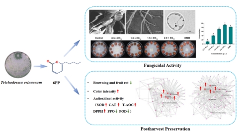该研究自2019年开始从海南省9个市县的荔枝园中采集荔枝根际土壤311份,分离获得300株木霉,从中筛选出8株对荔枝霜疫霉菌丝生长抑制率达80%的菌株,其中猬木霉LS019-2的挥发性物质的抑菌作用最强达到95.11%,采用固相微萃取和气质联用的方法,检测到6-戊基-2H-吡喃-2-(6PP)的含量最大,6PP显著抑制荔枝霜疫霉菌丝生长、孢子囊萌发、严重破坏菌丝体的超微结构,阻碣病害的发展;在保鲜过程中能保持较好的果皮色泽、增强抗氧化物酶活性、富集氨基酸、减缓失重,从而延长了荔枝的货架期;这些结果表明,6PP可能是一种有效的防治荔枝霜疫病的天然产物,也是一种新的荔枝果实防腐保鲜剂。