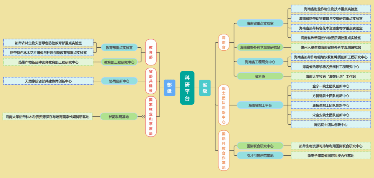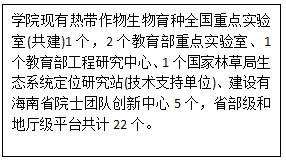 学院高度重视williamhill官网与成果应用,拥有1个热带作物生物育种全国重点实验室(共建),2个教育部重点实验室,1个教育部工程研究中心,1个国家林草局生态系统定位研究站(技术支持单位),建设有海南省院士团队创新中心5个,省部级和地厅级平台共计22个。