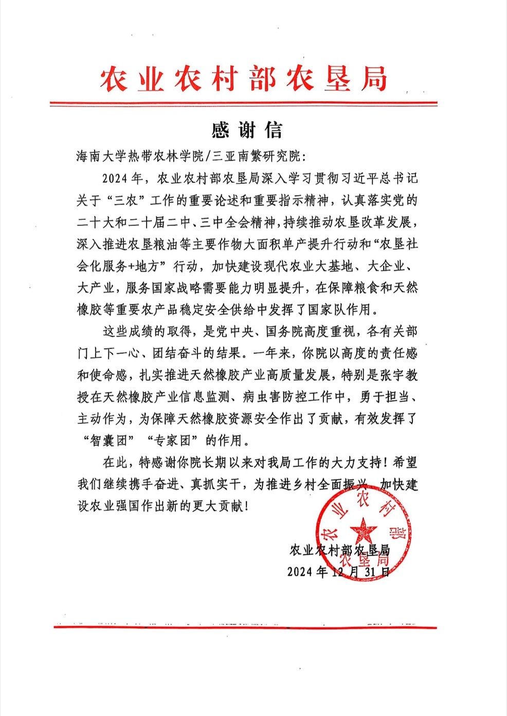 近日,热带农林学院(农业农村学院、乡村振兴学院)收到一封来自农业农村部农垦局的感谢信,信中对学院在推进天然橡胶产业高质量发展,特别是学院张宇教授在天然橡胶产业信息监控、病虫害防控工作中的突出贡献表示了感谢。