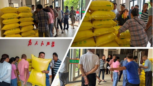 图为海南省科技特派员骆焱平为种植户分发肥料现场