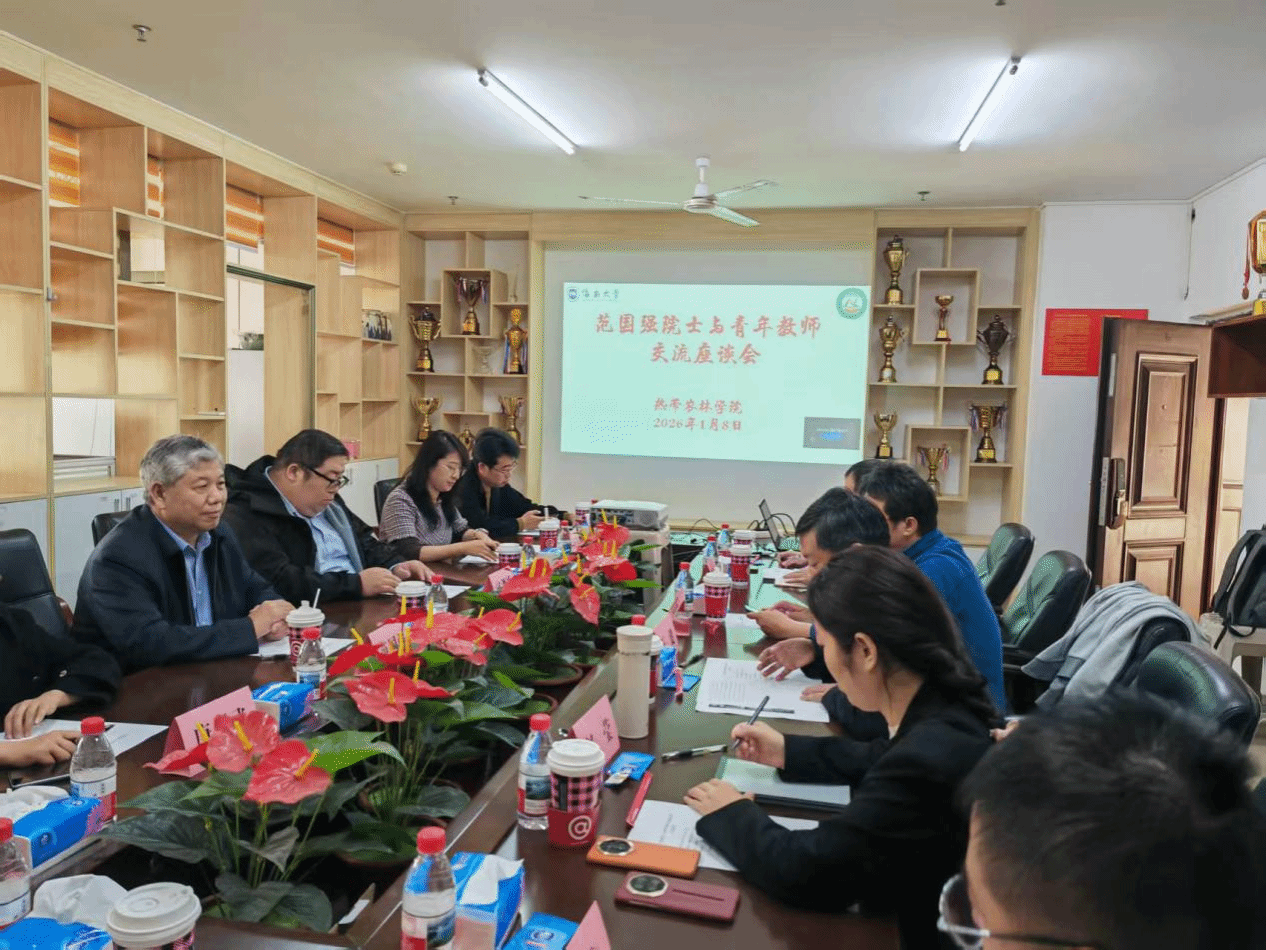2026年1月8日下午,英国威廉希尔公司农科楼会议室举行了范国强院士与青年教师交流座谈会。座谈会由英国威廉希尔公司热带农林学院王健教授主持,旨在促进学术交流,指导青年教师成长,推动学校林学及相关学科建设。