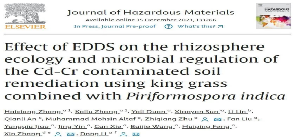 我院朱治强教授团队在《Journal of Hazardous Materials》发表论文:EDDS添加对王草-印度梨形孢共生体系修复Cd-Cr复合污染土壤的根际生态及微生物调控的影响