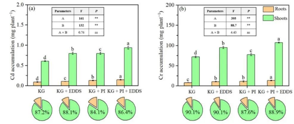 Cd-Cr复合污染土壤中,Cd和Cr主要积累在地上部。结果表明,EDDS的施用和P. indica的接种协同促进重金属在植株各部位的积累,尤其是地上部(图2)。