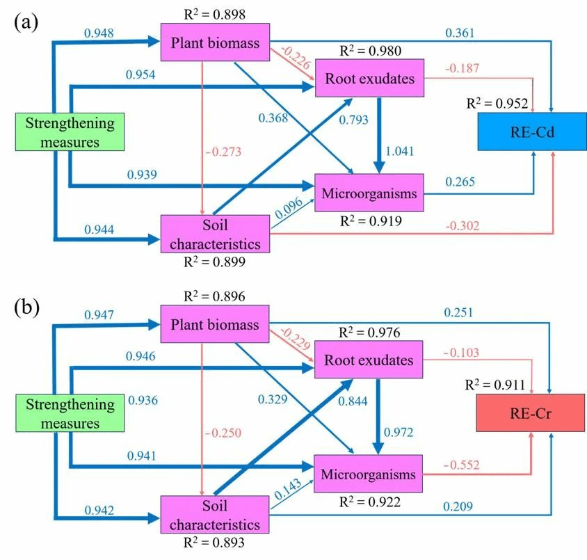Spearson相关系数显示,Proteobacteria、Gemmatimonadota、Basidiomycota、琥珀酸和水杨酸与土壤Cd或Cr有效态含量呈显著正相关(P<0.05)(图4)。结构方程模型分析表明,强化措施(EDDS施用和P. indica接种)不仅对Cd和Cr的去除效率有直接影响,还通过刺激植物生长、改变土壤理化性质、影响根系分泌物组成和土壤微生物群落结构来间接影响Cd和Cr的去除效率(图5)。