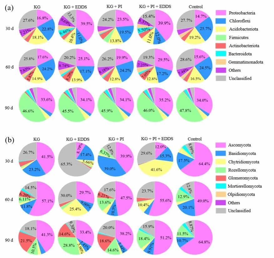 3 不同处理下主要根际细菌(a)和真菌(b)在门水平的相对丰度