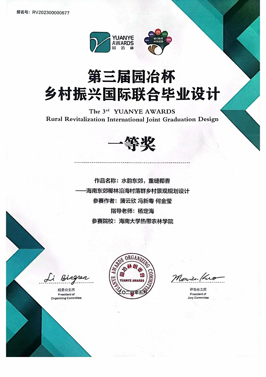 在杨定海教授及风景园林教学团队的指导下,我校风景园林专业本科生蒲云欣、冯新粤与何金莹的作品《水韵东郊,重缝椰香——海南东郊椰林沿海村落群乡村景观规划设计》最终脱颖而出,获得了一等奖。