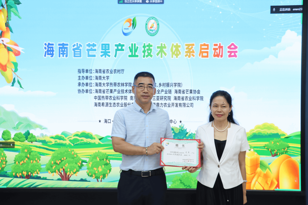 海南省农业农村厅吴明海党组为海南省芒果产业技术集成创新中心授牌,并为首席科学家颁发聘书。海南省芒果产业链周泽雄副链长、陈显明副链长为岗位科学家和站长颁发聘书。海南省芒果产业技术体系首席科学家缪卫国代表体系与海南希源生态农业股份有限公司、海南鼎力农业开发有限公司签订合作协议。