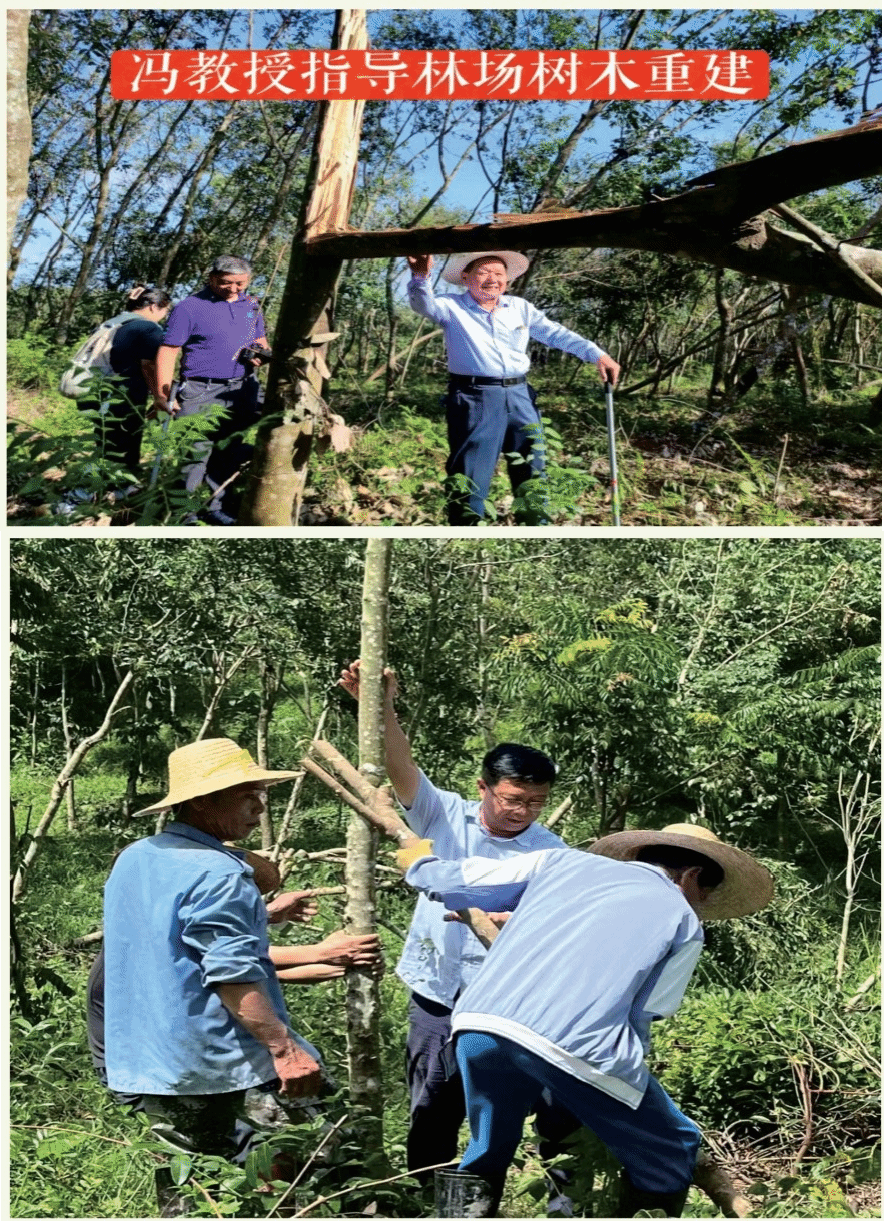 台风“摩羯”过后,位于王五镇的海南热带珍稀林木保育基地受灾严重,9月12日-14日,王五镇“博士村长”服务团,于旭东教授,冯纪福教授携研究生蔡煜祺,李奇前往灾区抗风救灾。指导不同种类、受灾不同程度的珍稀树木的灾后恢复工作,并亲自参与劳作。