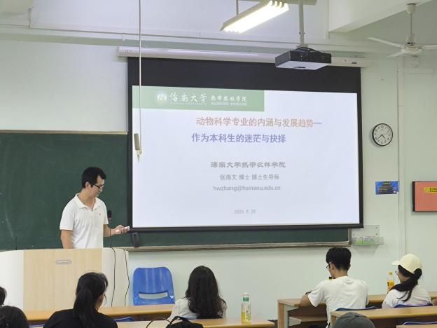 会上,张海文老师以“专业与人生规划”为主题,为新生带来了一场生动的讲座。他从动物科学专业的发展趋势、学业规划与人生选择等方面进行了深入阐述,结合自身经历引导同学们科学规划学业,勇于探索未来发展方向。